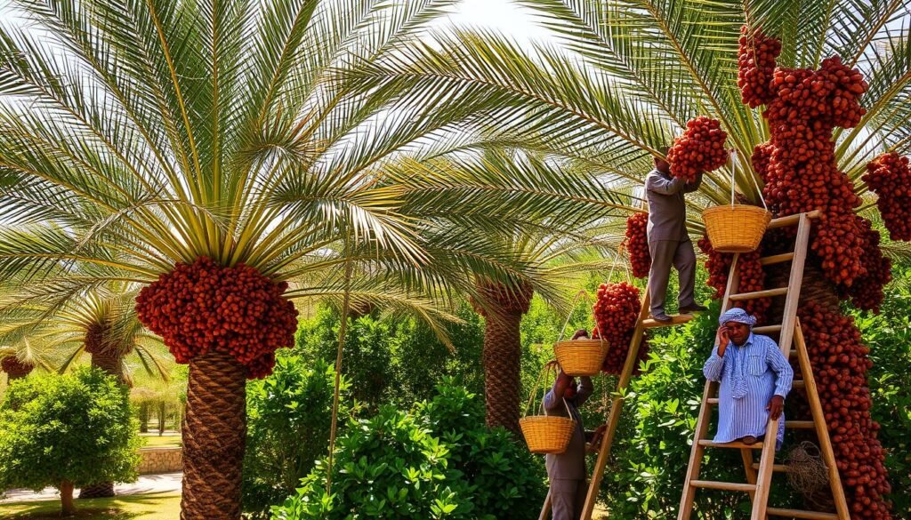 Gulf Arabia, harvesting dates is a tradition passed down through generations. Farmers climb the trees, pick the dates, and sort them carefully. This keeps the dates fresh and flavorful.